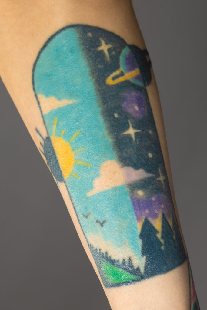 A central theme throughout all of my tattoos is duality. Light and dark, day and night, warm and cool colors, Earth and space — none of these cancel each other out. Instead, they depend on each other. Contrast is what allows beauty and art to be seen more clearly. You notice light because there is darkness. You notice color because there is shadow. You notice the stars because of the night. That coexistence is something I find incredibly meaningful and visually powerful.